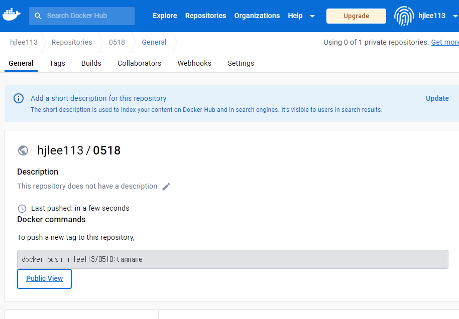 [root@Docker1 ~]# docker push hjlee113/0518:0.0