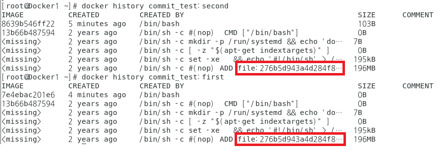 [root@Docker1 ~]# docker history commit_test:second //history보는 명령어
