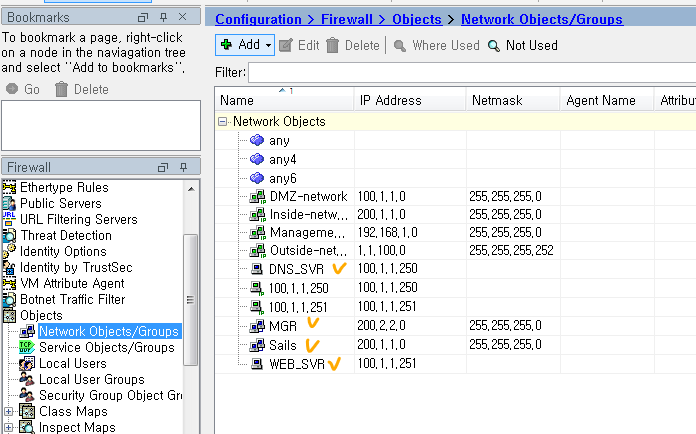 ciscoasa(config)# route Outside 0 0 1.1.100.2 //0 0 이 0.0.0.0 0.0.0.0이다.