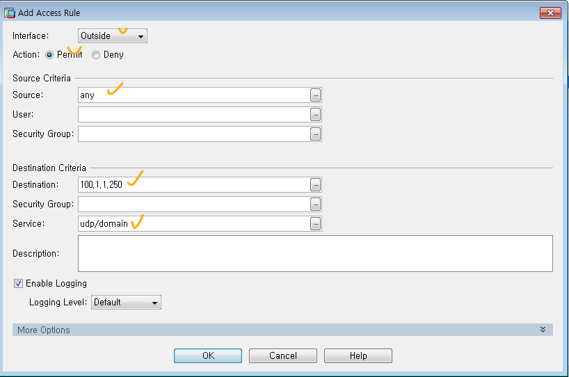 ciscoasa(config)# access-list OUT->IN extended permit udp any host 100.1.1.250 eq 53