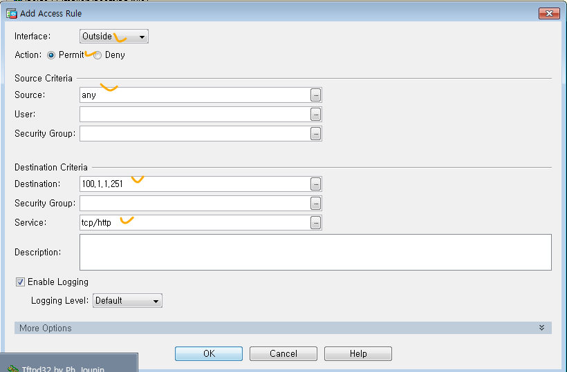 ciscoasa(config)# access-list OUT->IN extended permit tcp any host 100.1.1.251 eq 80