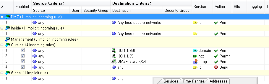 Inside와 DMZ에서 Outside로의 접근은 Sec_level 에 의해 동작한다. Outside에서 DMZ 에서 위치한 다음 서비스들에 대해 접근을 허용하시오.
